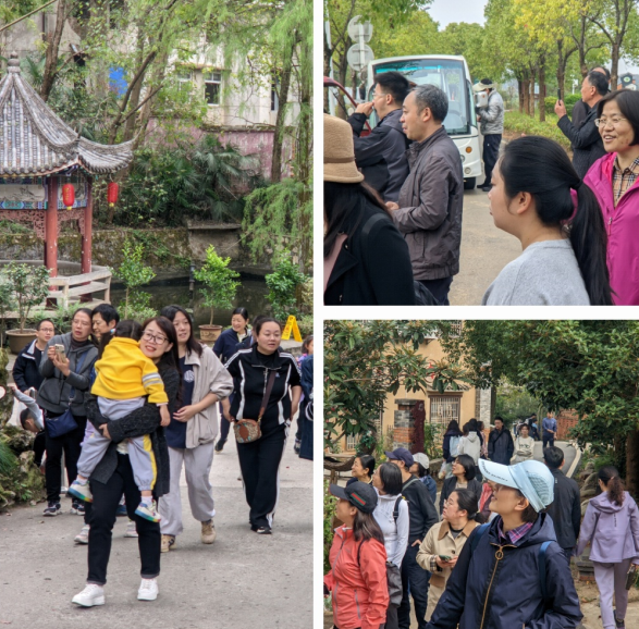 行车1个小时抵达五里界的小朱湾,仿佛穿越了时空,踏入了一幅古色古香的画卷。这里的道路平整如洗,两旁绿化郁郁葱葱,仿古建筑错落有致,每一砖一瓦都透露着历史的韵味与自然的和谐。漫步在浓荫道上,耳边是鸟语轻唱,鼻尖萦绕着泥土与花草的清新香气,每一步都踏在了田园的诗意上。在这里,老师们徜徉在社会主义新农村的新风、新貌、新景中,暂时忘却了都市的喧嚣,只愿时光能慢些,再慢些。