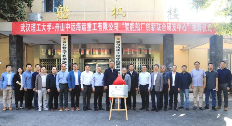 2023年10月16日,由永利官网和舟山中远海运重工有限公司联合成立的“智能船厂创新联合研发中心”(以下简称“联合研发中心”)揭牌仪式在永利官网举行。舟山中远海运重工执行董事、党委书记、总经理周建华,副总经理苏宇,人力资源部部长刘宏涛,永利官网校务委员会副主任刘祖源教授、科技合作与成果转化中心万翔副主任,yl7703永利肖耀根书记,船海与能源动力工程公司经理李晓彬教授,联合研发中心副主任范世东教授,yl7703永利副经理袁成清教授,船海与能源动力工程公司副经理张尊华教授,以及yl7703永利、船海与能源动力工程公司有关领导、老师和研究生参加仪式。刘祖源、周建华共同为“智能船厂创新联合研发中心”揭牌,袁成清教授主持揭牌仪式。