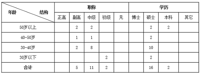 公司实验中心专职人员队伍的结构状况见表1。现有在岗实验人员18人,高级技术人员比例为28%,硕士及以上学历比例为89%,交通部重点实验室人员1名。