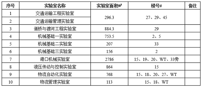 实验室使用面积约8500平方米,实验设备约3000/套,设备资产总值达9000多万元,为公司实验教学和科研工作奠定了坚实的基础条件。实验中心设有资产管理员2名,负责整个交通与物流工程公司教学、科研设备的进账、报废;各专业实验室有指定实验室管理员负责本实验室的安全与教学、科研设备的运维管理。本科教学专业实验室分布情况详见表2